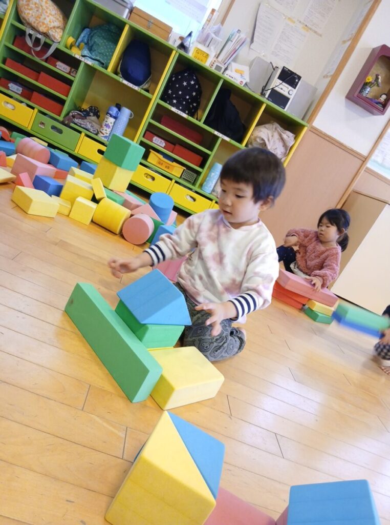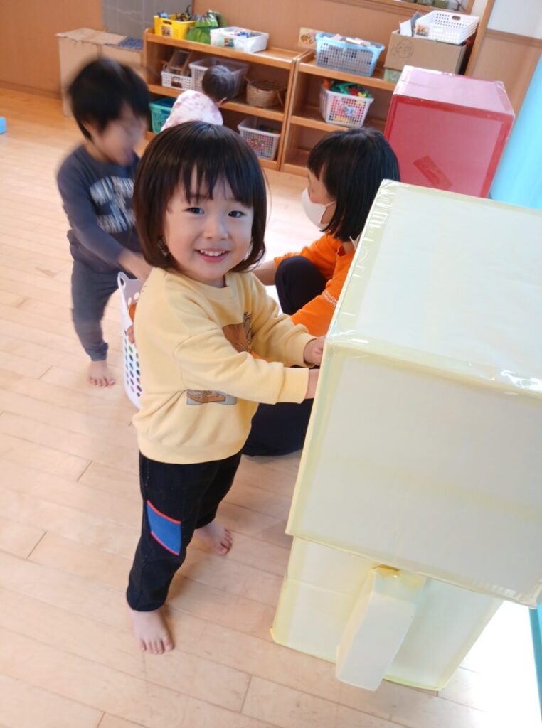 ちゅうりっぷのお部屋ではソフトブロックにおままごとに段ボールのおうち。