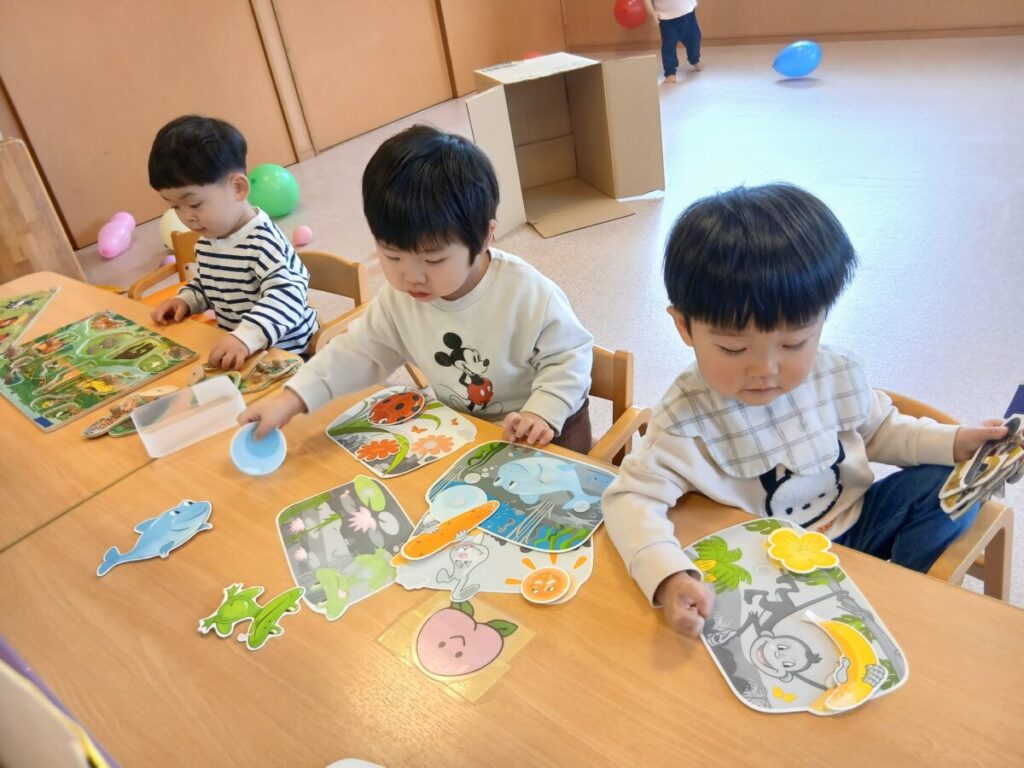 お部屋チームは並んでパズルを…。