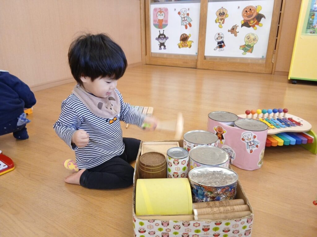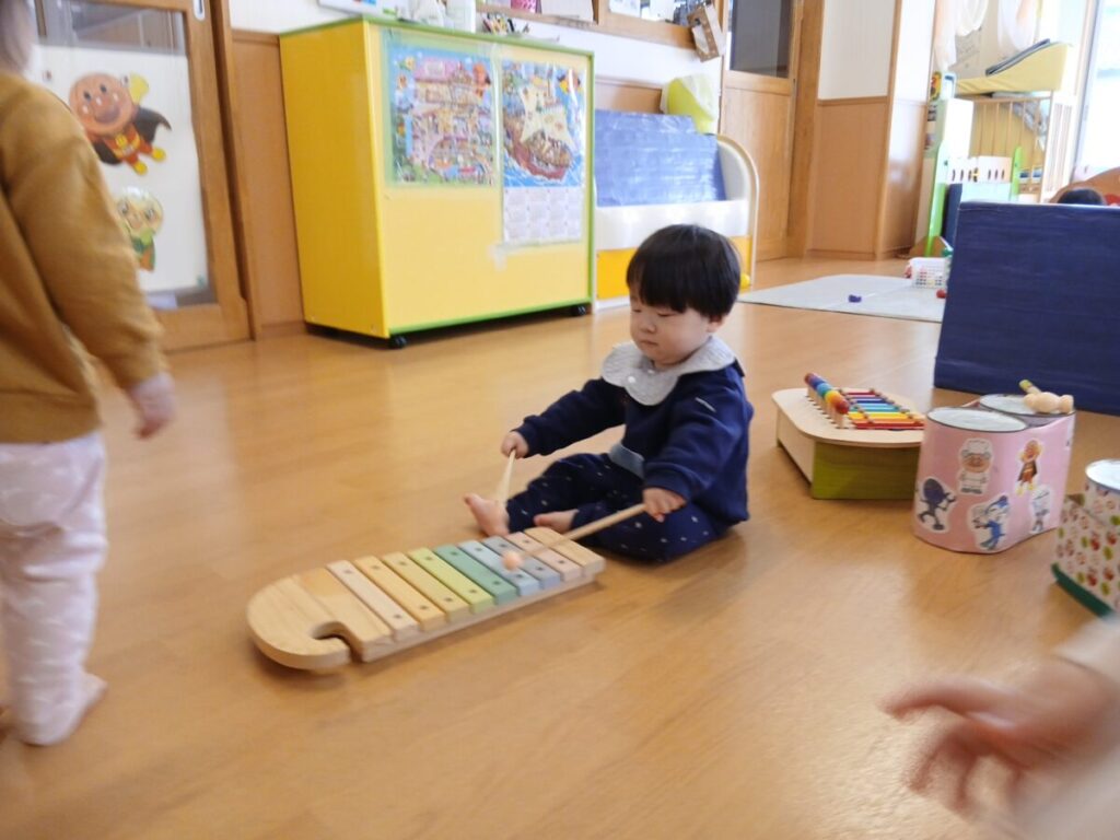 そしてお部屋では、木琴や太鼓をたたいて楽器あそびもしました。
