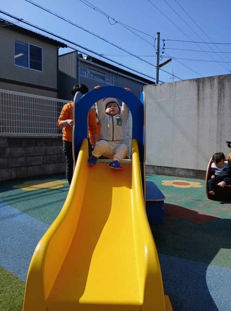 すべり台のここまで来ると、「ぶら~ん」と鉄棒のようにぶら下がりたいようです。