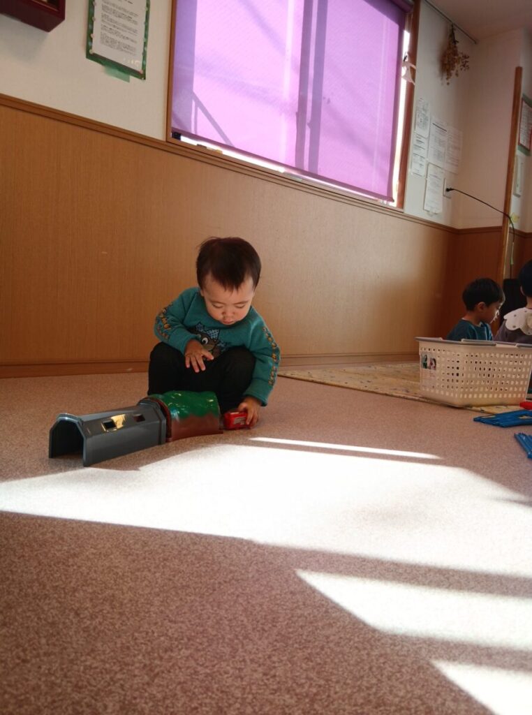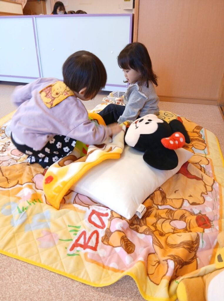 お人形を寝かせてあげているお友達。
