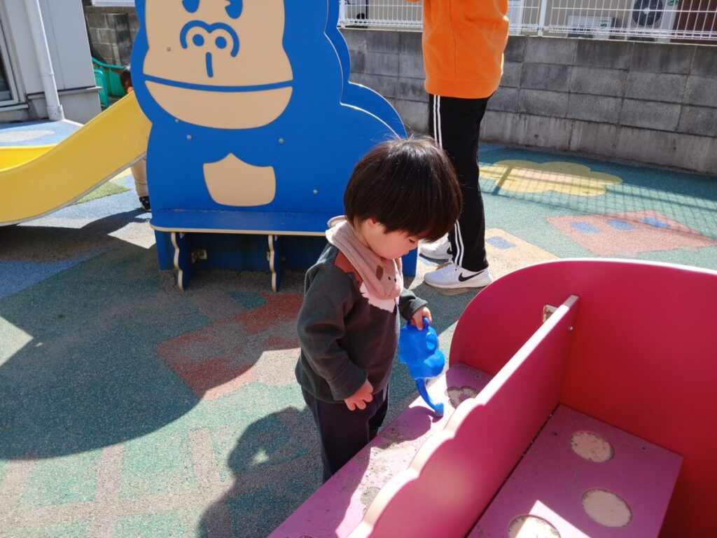 ジョウロをもって何をしているのかな?と見ていたら、中に砂を入れて水やりにみたいにしていました。