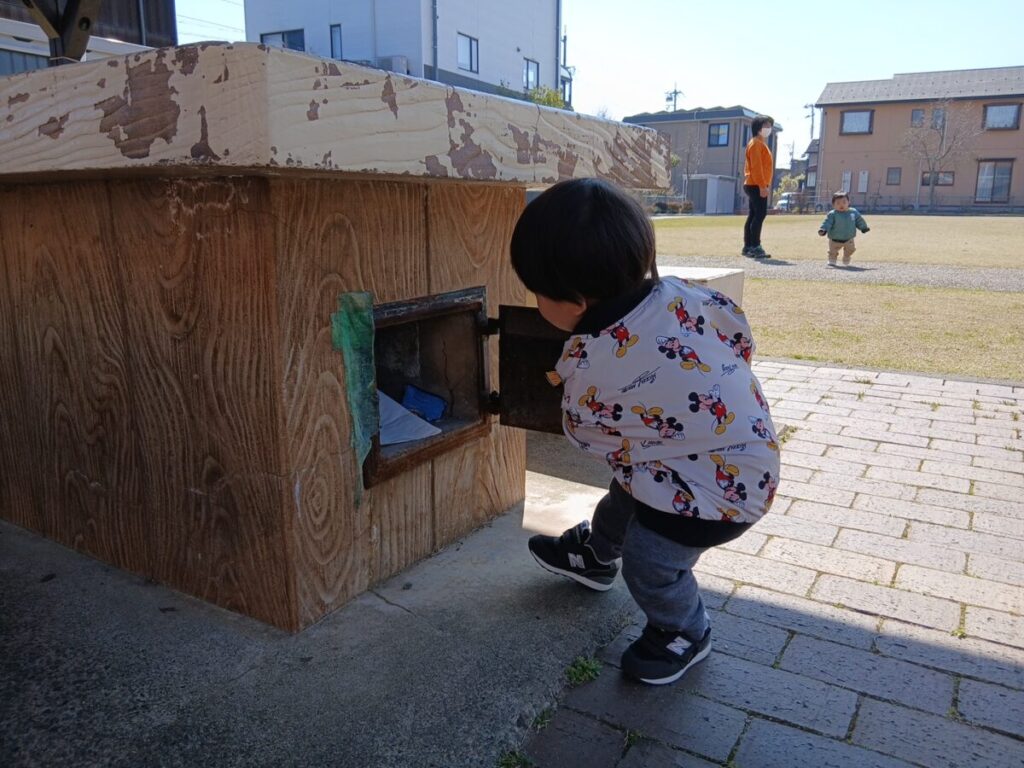 これもいつも気になってあけています。「あっ!なんかみ~つけたー!」紙が入っていました。しばらく大事そうに持って歩いていましたよ。