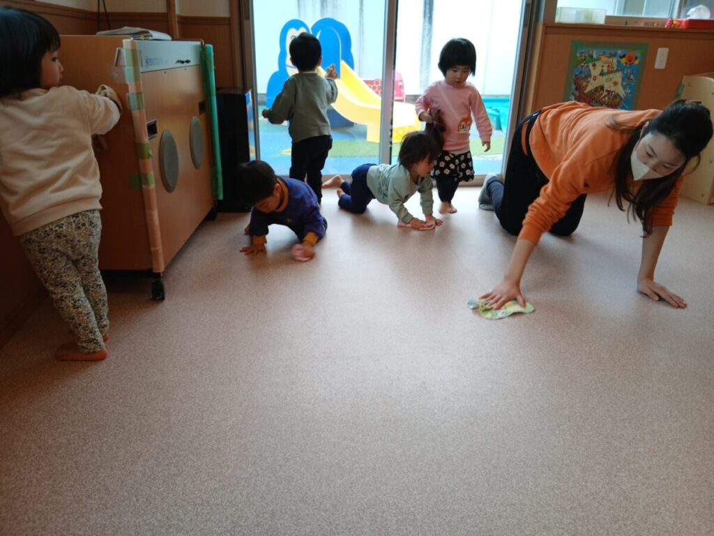お部屋さんにありがとうの気持ちを込めて、みんなでお掃除をしました。