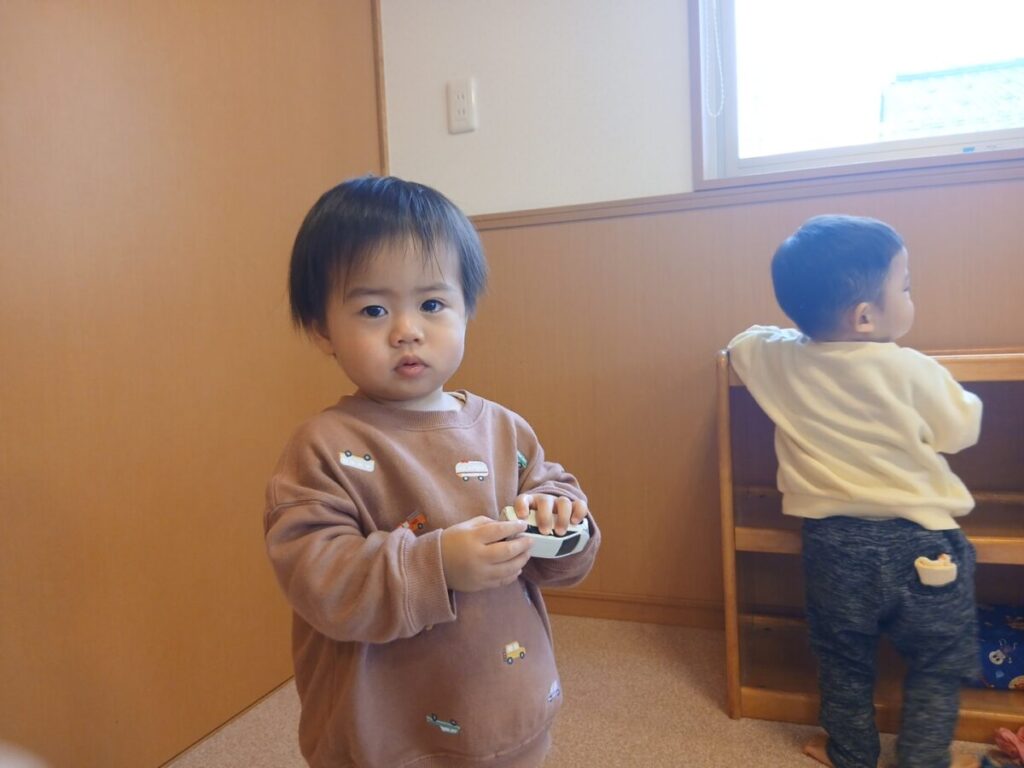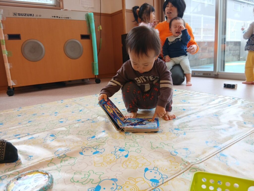 泣いたり、泣き止んだりの繰り返しで車であそんだり、絵本を見たりして楽しんでいる様子でした。